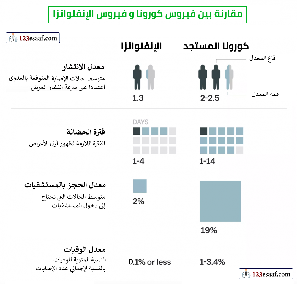 ما هو واضح حول هذا الفيروس هو أنه ينتشر بسرعة أكبر بكثير من الإنفلوانزا قد يقارب ضعف المعدل. ففي حين يصل معدل الإصابة بالإنفلونزا إلى 1.3 شخصا ، فإن معدل الإصابة بفيروس كورونا المستجد يتراوح بين 2.0-2.5 شخصا. يمكن أن يكون لهذا الاختلاف تأثير أسي في تضاعف معدلات نشر الفيروس.