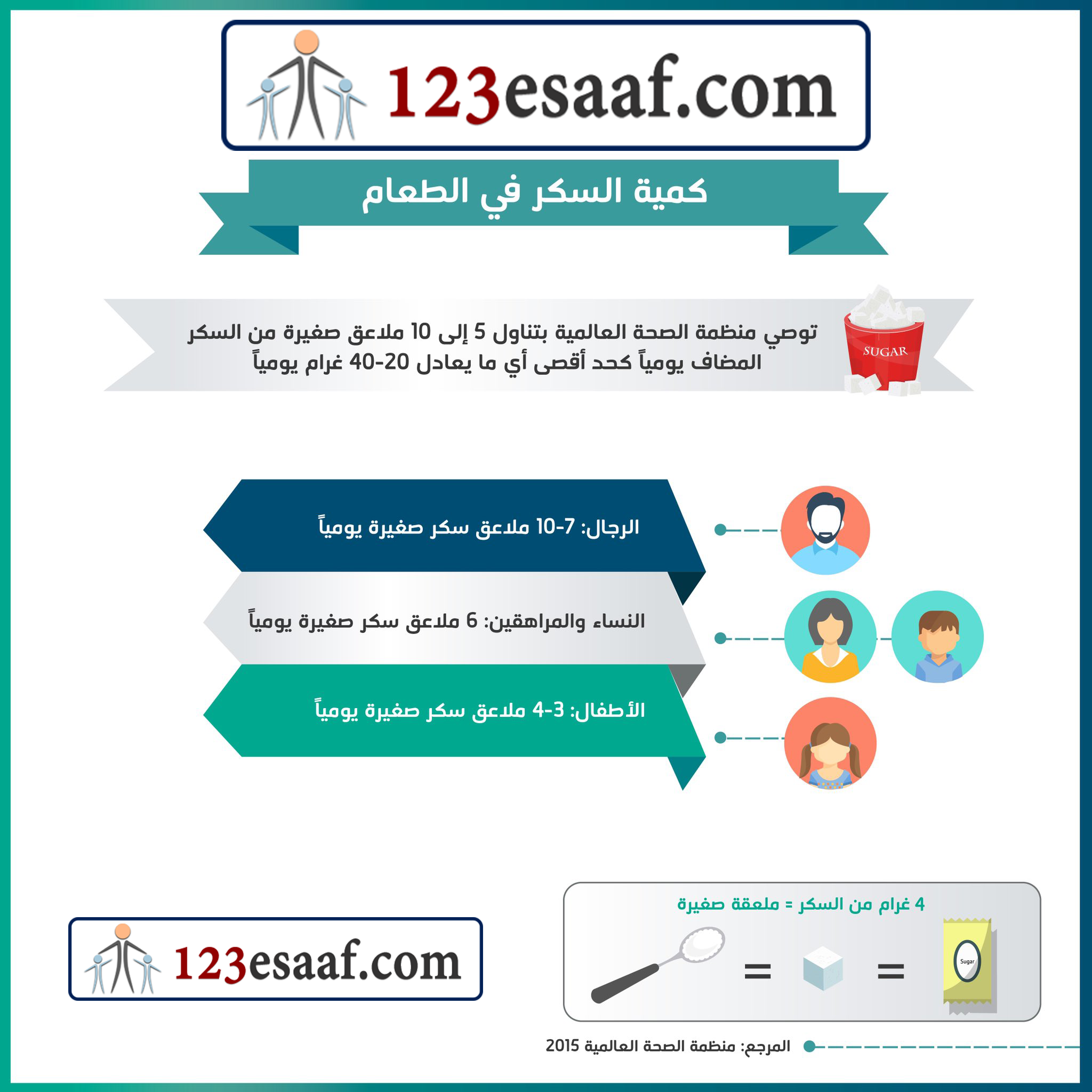 وبحسب توصيات منظمة الصحة العالمية لا يجب أن تزيد نسبة السكر المتناولة يوميا عن 20 غم الى 40 غم يوميا، وهذا يتوافق بما نسبته خمسة بالمئة من السعرات الحرارية الضرورية للجسم. وقبل أن تتنفس الصعداء عزيزي القارئ وتقول بأن استهلاكك اليومي أقل من ذلك بكثير، فيجب عليك حساب ما يلي أولا من أجل معادلة أكثر دقة.