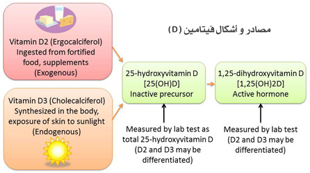 يأتي فيتامين (D) من مصدريْن هما: مصدر داخلي المنشأ ؛ حيث يتم إنتاجه في الجلد عند التعرُّض لأشعة الشمس ، و مصدر خارجي المنشأ ؛ من خلال ما يتم تناوله في الأطعِمة و المُكمّلات الغذائيّة. هناك بعض الاختلافات البسيطة في التركيب الكيميائي لأنواع فيتامين (D). و تُسمّى فيتامين (D2) (إرجوكالسيفيرول ergocalciferol ، و الذي يكون نباتى المصدر) و فيتامين (D3) (كوليكالسيفيرول cholecalciferol ، و الذي يكون حيوانى المصدر). يوجد الشكل (D2) في الأطعِمة المُعزّزة و في مُعظم الفيتامينات و مُكمّلاتها. أما فيتامين (D3) فهو الشكل الذى يتم إنتاجه في الجسم ، و يُستخدم أيضا في بعض المُكمّلات الغذائيّة. إن فيتامين (D2) و (D3) لهما نفس القدر من الفاعِليّة عندما يتم تحويلهما بواسطة الكبد و الكُلَى إلى الشكل النشِط 1,25-ثنائي هيدروكسي فيتامين (D).