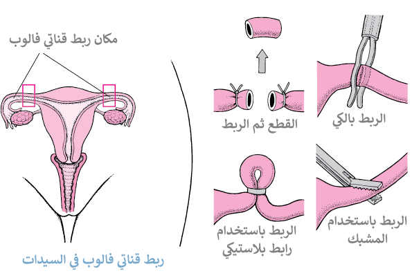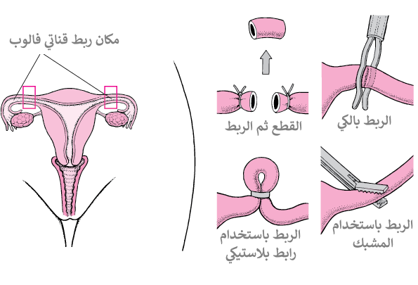 يتم ربط قناة فالوب عن طريق وضع مشبكين أو رباط أو كي بالكهرباء ، ثم يتم قطع القناة بين المشبكين لمنع أى احتمال لالتئام القناة بعد ذلك ... المزيد